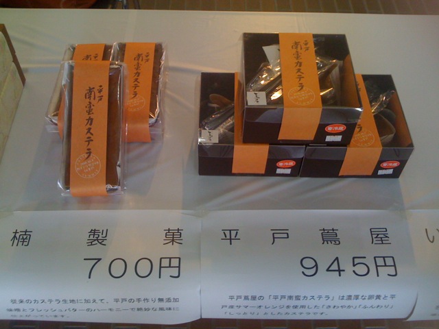 平戸菓子工業組合による新商品「平戸南蛮カステラ」を牛蒡餅本舗 熊屋、平戸鳶屋、いちやま製菓店、くろだ玄海堂、菓子処 津乃上、菓子工房 えしろ、楠製菓、プチ・イケガミのそれぞれ違う「平戸南蛮カステラ」が出品されていた。
