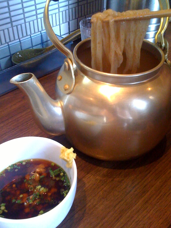 やかんにうどんが入ってでてくる見た目のインパクト大な釜揚げずぼらは漬け麺